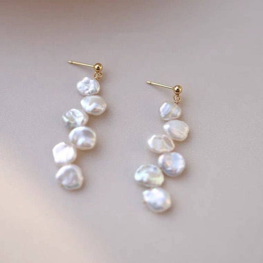 18K Gold Natural Keshi 6-8mm Baroque Pearls Flat Side Flora Earrings