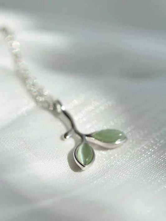 Silver Olive Branch Imitation Cat's Eye Green Stone Necklace ~16-17 inches