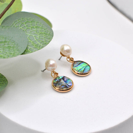 Fresh Water Pearl Round Abalone Shell Two Link Earrings