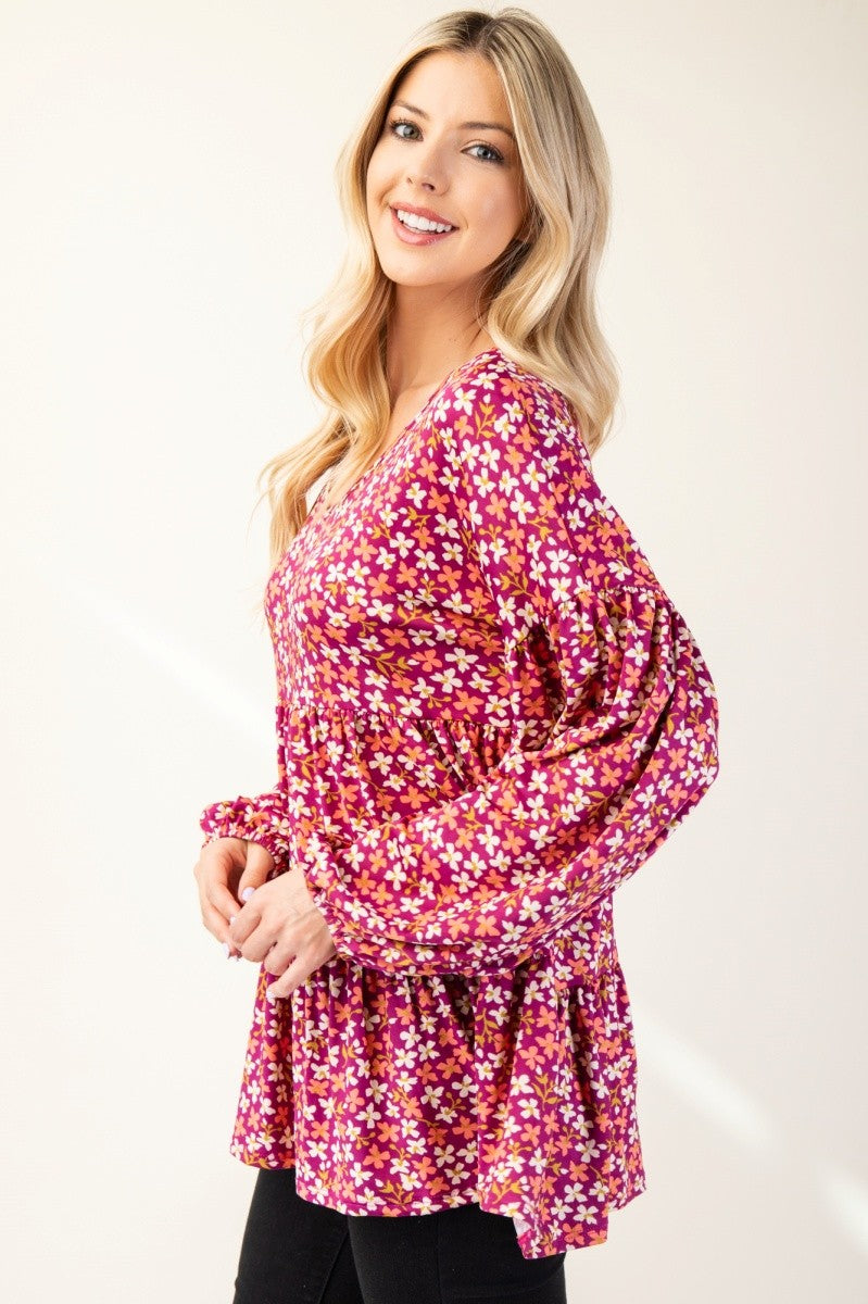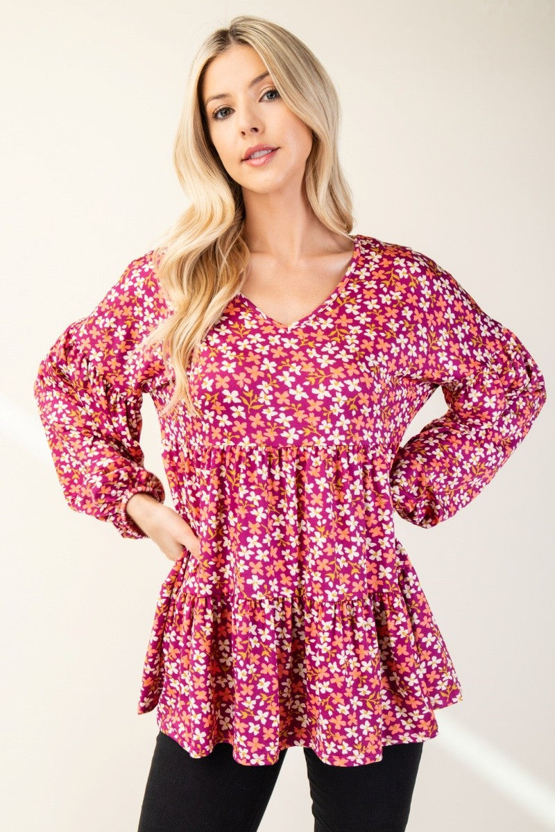 Charming Celeste Full Size Floral V-Neck Balloon Sleeve Blouse