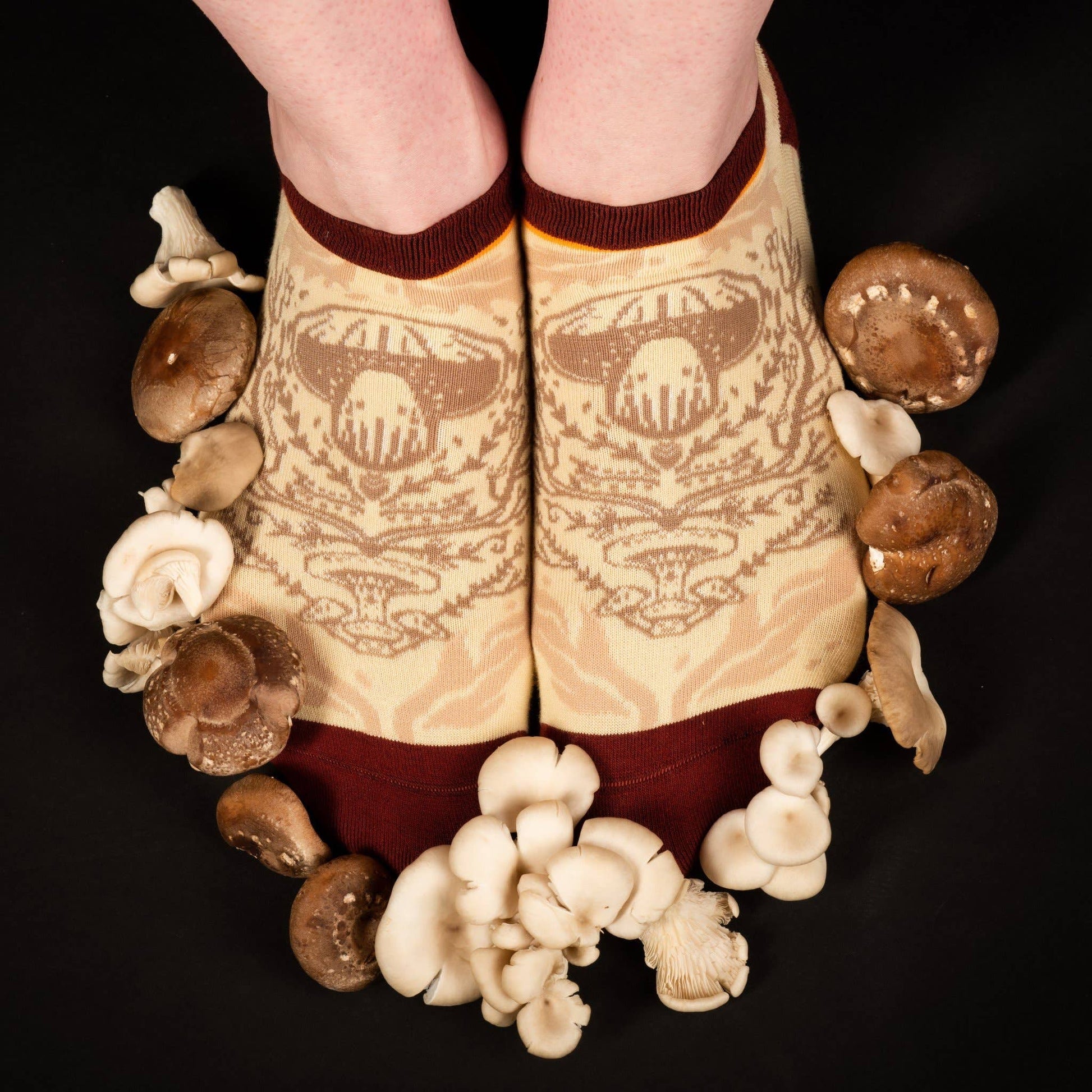 Slip into something a little more spellbinding with our Death Cap Mushroom Ankle Socks — a cozy enchantment for your feet. Woven from a luxurious blend of combed cotton, nylon, and spandex, these socks offer dreamy softness and whimsical charm. Their intricately illustrated design celebrates the mysterious beauty of the death cap mushroom, transforming an everyday accessory into a wearable forest fable.